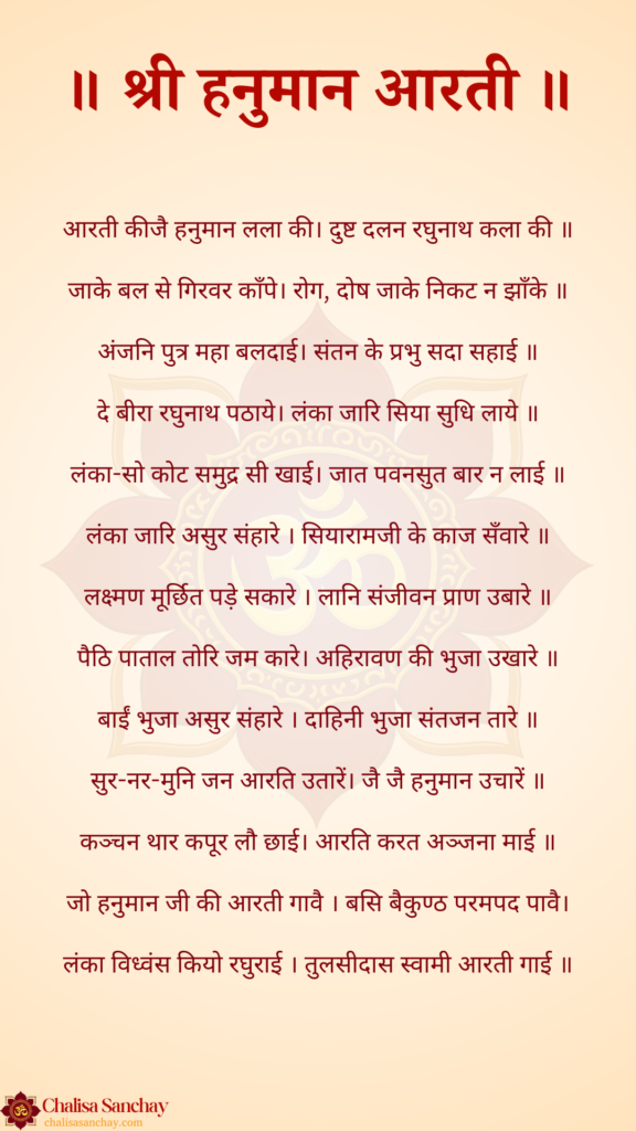 श्री हनुमान आरती भगवान श्री हनुमान की भक्ति का एक प्रमुख और प्रभावशाली माध्यम मानी जाती है। श्री हनुमान को शक्ति, साहस, सेवा और अटूट भक्ति का प्रतीक माना जाता है, इसलिए उनकी आरती का पाठ विशेष रूप से मंगलवार और शनिवार को किया जाता है। धार्मिक मान्यताओं के अनुसार, श्री हनुमान आरती का नियमित गायन मन की स्थिरता बढ़ाने के साथ-साथ नकारात्मक प्रभावों से संरक्षण प्रदान करता है और भक्त को आध्यात्मिक ऊर्जा से जोड़ता है।